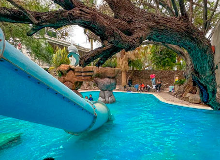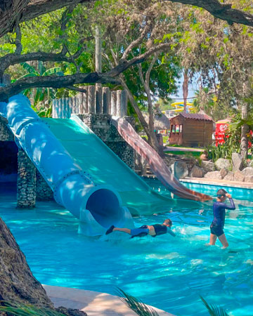 Entorno Seguro: El suelo es antideslizante y la zona está cuidadosamente separada de las albercas profundas, garantizando que el juego sea solo diversión.